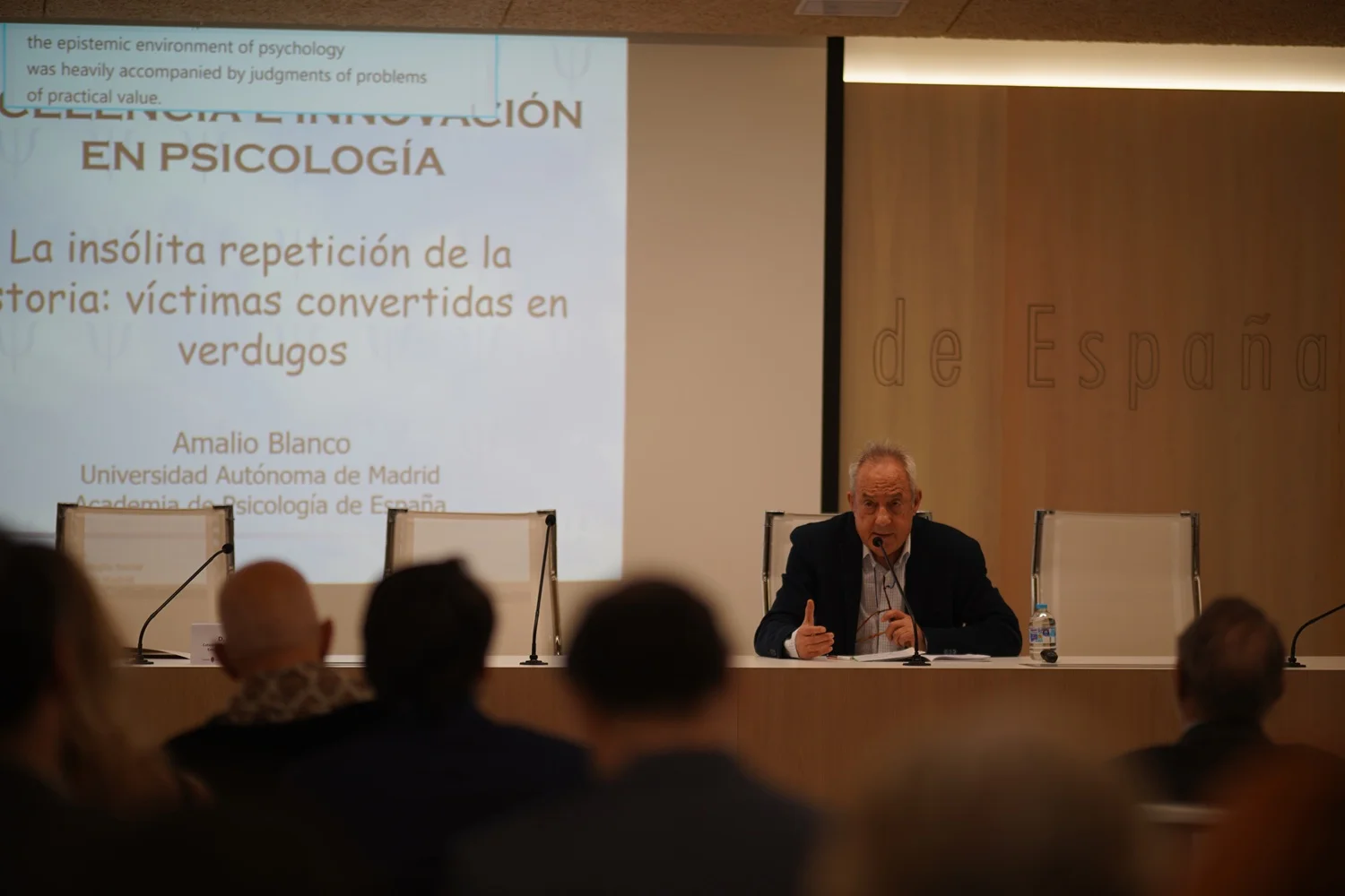 Después, atendimos a la conferencia «La insólita repetición de la historia: víctimas convertidas en verdugos», con Amalio Blanco, catedrático emérito de Psicología en la UAM y académico de número de la Academia de Psicología de España.